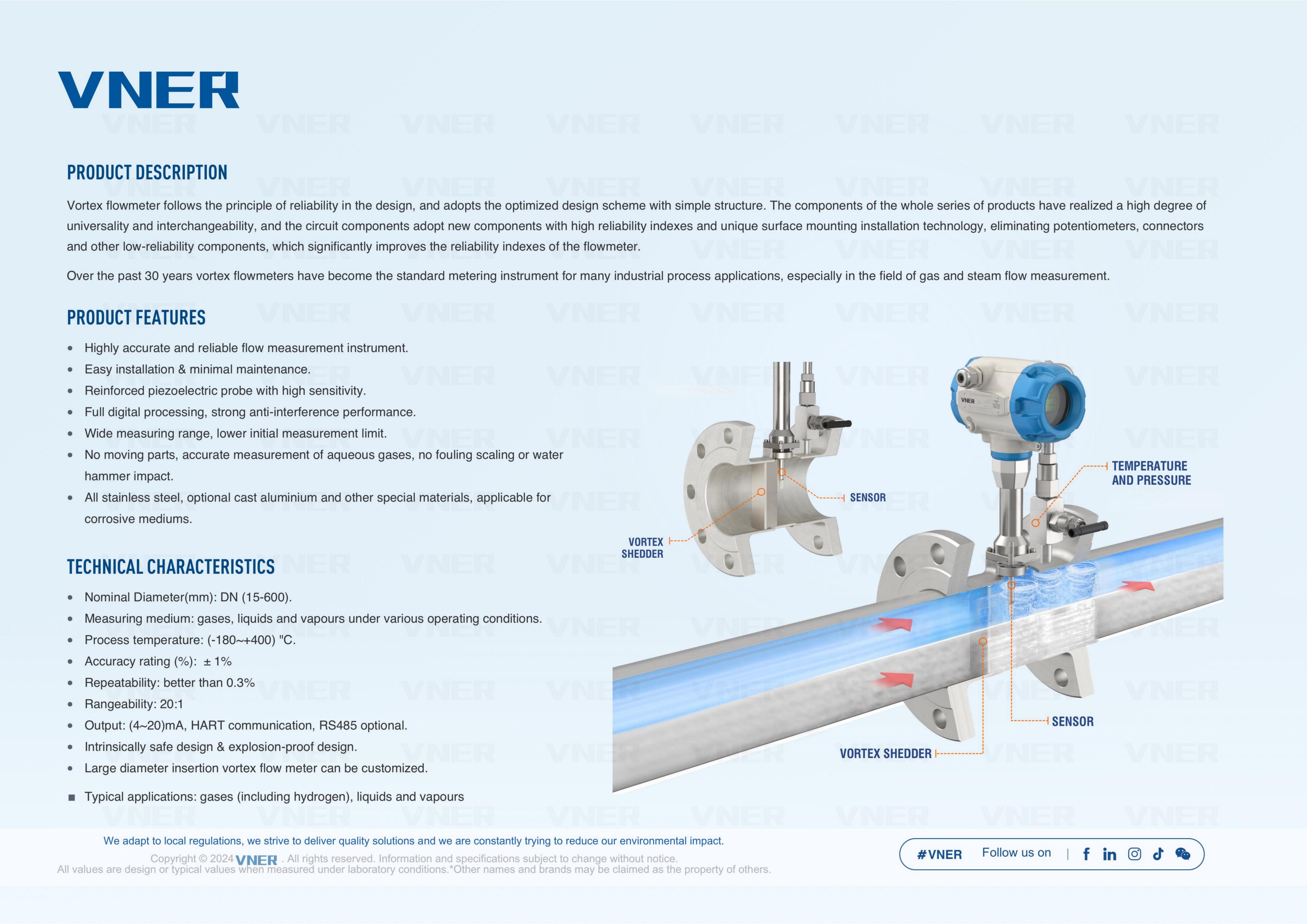 | P + T Compensation | Vortex + pressure + RTD | True mass flow | ±1.0–2.0% of reading | Superheated steam, natural gas, process gas |